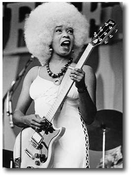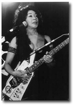 At age twelve my first instrument was a ukulele used to accompany myself while singing scales. I attended on scholarship The High School of Performing Arts in New York as a dance major, studied drama, music theory, several instruments and worked as a model. I bought a guitar after seeing Mickey & Sylvia at the Apollo. My song writing and arranging had already begun. The guitar was [my] goal. After winning on Amateur Night at the Apollo Theater as a singer I signed a one shot recording contract with a major label and formed The Fabulous Jewels, a guitar, bass and drums trio and played nightclubs. As a vocalist I played many Supper Clubs on Long Island and east side Manhattan. The club supplied piano-bass-drums trio and I supplied the charted arrangements of the songs I was going to do. I also was a singer in the Buddy Johnson Orchestra filling for Ella Johnson at the Savoy Ballroom and maintained my band besides working with Bo. In 1960-68 I added sax, two trumpet players and a B-3 organist. I grew tired of the area so I relocated to San Jose in Œ69 and formed a new unit called Little Jewel & The Family Jewel. This unit was known as Lady Bo & The Family Jewel aka The Bo Diddley Band in the U.S., in 1972-89 and Europe, 1987.